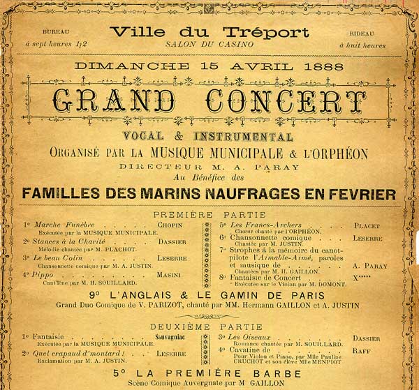- La Seconde Symphonie en la, sous-titrée Le Tréport, tour à tour méditative, nostalgique, tumultueuse et sereine, conçue à la faveur de longues promenades sur les falaises de sa ville natale, peu après la mort d'Auguste Paray. Il la crée au Châtelet en avril 1940, avec les musiciens d'une grande formation Colonne-Lamoureux, Paul Paray et son ami Eugène Bigot ayant opéré la fusion de leurs deux orchestres.