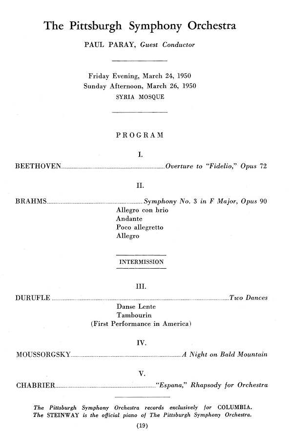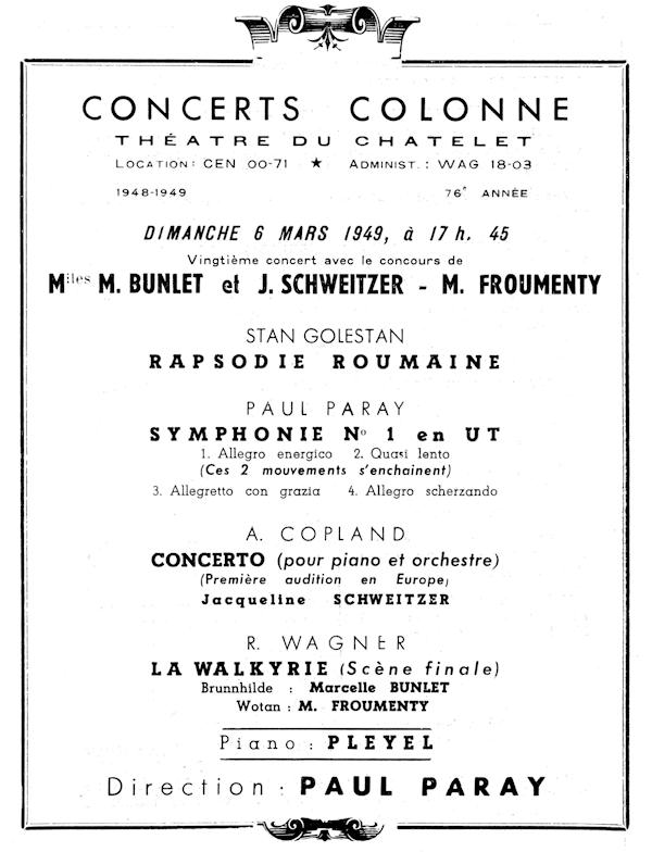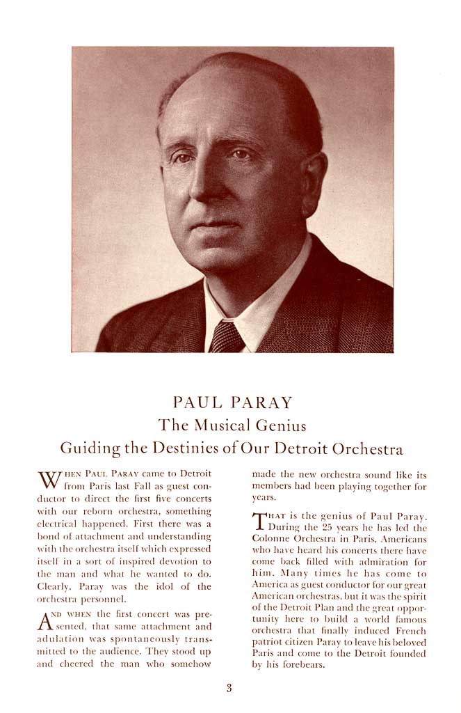 Il avait déjà produit forte impression aux Etats-Unis, en 1939, à la tête du New York Philharmonic, et avait alors refusé le poste de co-directeur du NBC Symphony Orchestra, aux côtés de Toscanini. Depuis la fin de la guerre, en 1945, les appels des Etats-Unis se faisaient pressants. En octobre 1951, au terme d'une prestigieuse série de concerts avec les orchestres de Boston, New-York, Cincinatti, Philadelphie, Pittsburgh et Chicago, Paul Paray accepte de rebâtir le Detroit Symphony Orchestra, dont il fera, pendant ses onze ans de Direction musicale, "le premier orchestre français des USA". Jusqu'en 1955, il réussit à partager ses activités entre l'ancien et le nouveau continent. Mais à partir de 1956, installé durablement à Motown city, il laisse à Charles Münch la présidence de l'Orchestre Colonne, et ne revient en France que pour deux séries de concerts annuels, principalement avec l'Orchestre National.