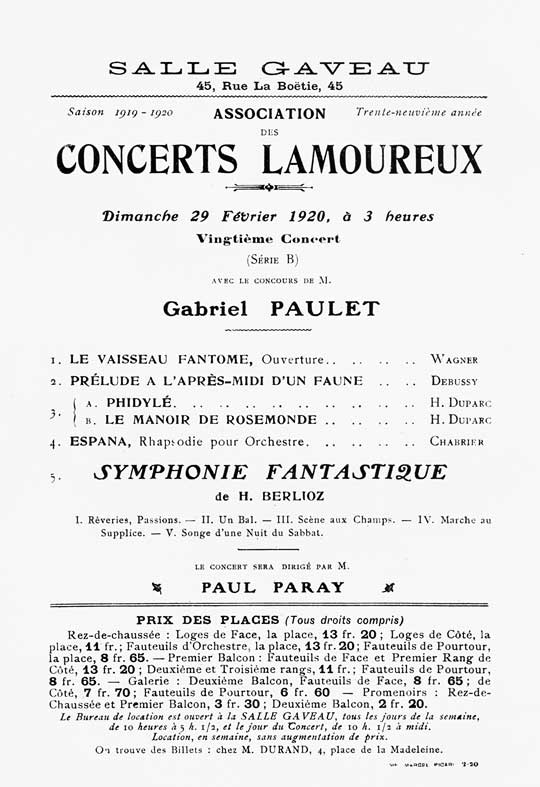 Paul Paray se donne alors avec ardeur à son travail d'interprète. Sa vaste culture et sa prodigieuse mémoire musicale lui permettent d'exceller dans le répertoire classique, qu'il soit allemand, français ou russe, et de mener les nombreuses créations que lui confient ses contemporains : Gabriel Fauré, Maurice Ravel, Florent Schmitt, Gabriel Pierné, Louis Aubert, Lili Boulanger, Pierre de Bréville, André Caplet, Jacques Ibert, Ermend Bonnal, Albert Roussel, Claude Delvincourt, et bien d'autres. Il présente au public parisien de nouveaux interprètes de grand talent, comme le violoniste Jascha Heifetz (en février 1921) et le jeune prodige Yehudi Menuhin (en février 1927).